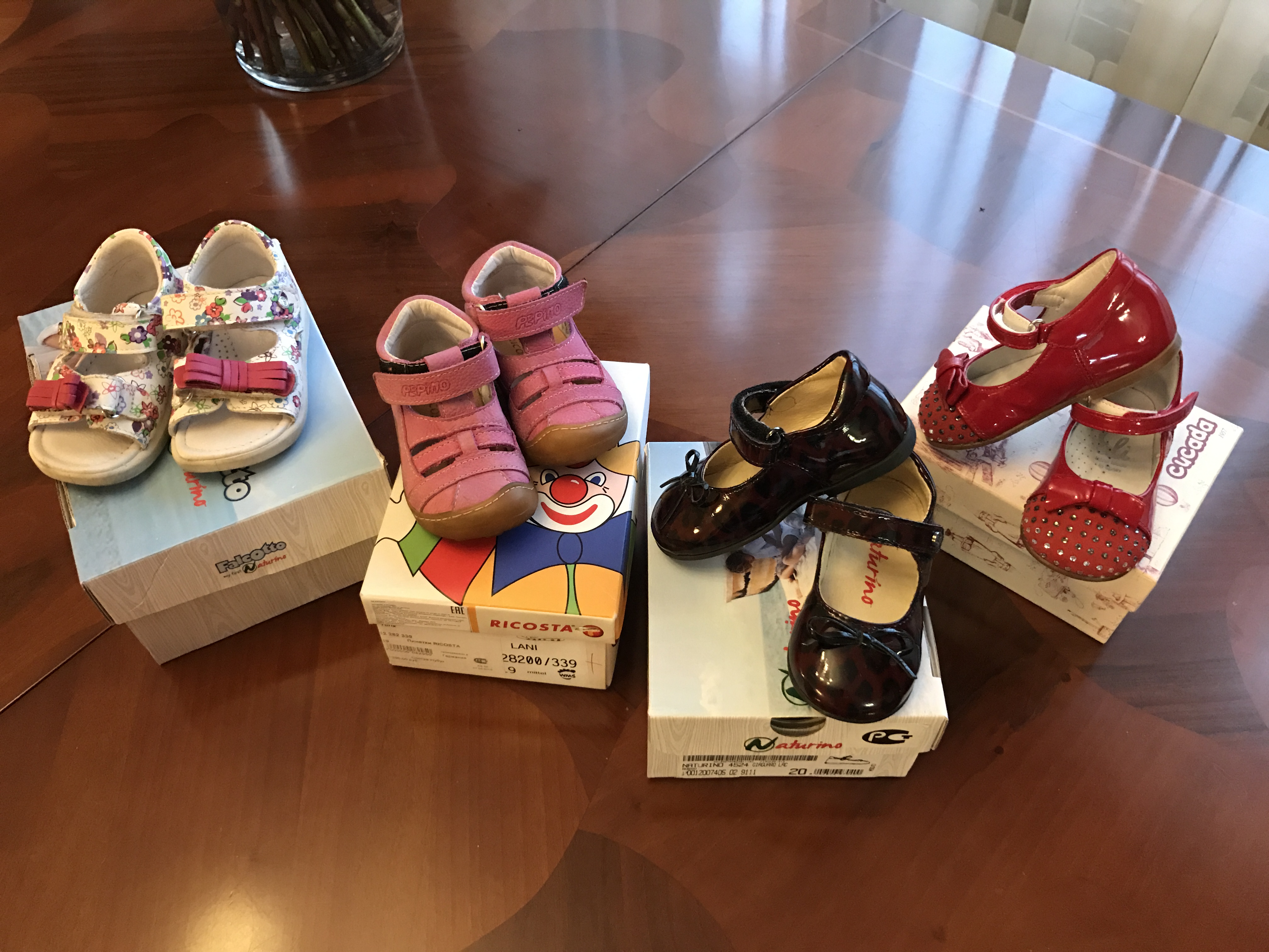Обувь для девочки, 19-20-21, новые и бу Разбираю одежду, обувь. Есть 4 пары, которые сын точно не наденет)) 1. Босоножки Falcotto, 21 размер, надели 1-2 раза, пролетели с размером. Нога в годик выпадала, в два уже, конечно, малы были. 2000 руб 2. Розовые ботиночки Ricosta, размер 19, бу, но не стоптаны вообще. Кожа и внутри, и снаружи. 1500 руб. 3. Туфли Naturino, 20 размер, надеты раз 5, в помещении. Лаковые, кожа. 2000 руб. 4. Туфли Cucada, 20 размер, красные, лак, замша. Печаль моя(((( новые абсолютно, не надели ни разу((( 3000 руб.Вложение 40527