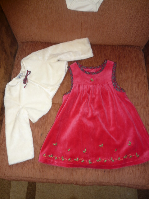 В комлпекте сарафан, бодик с рюшками на рукавах и попке, накидка-шубка и даже резиночка на голову в тон:)