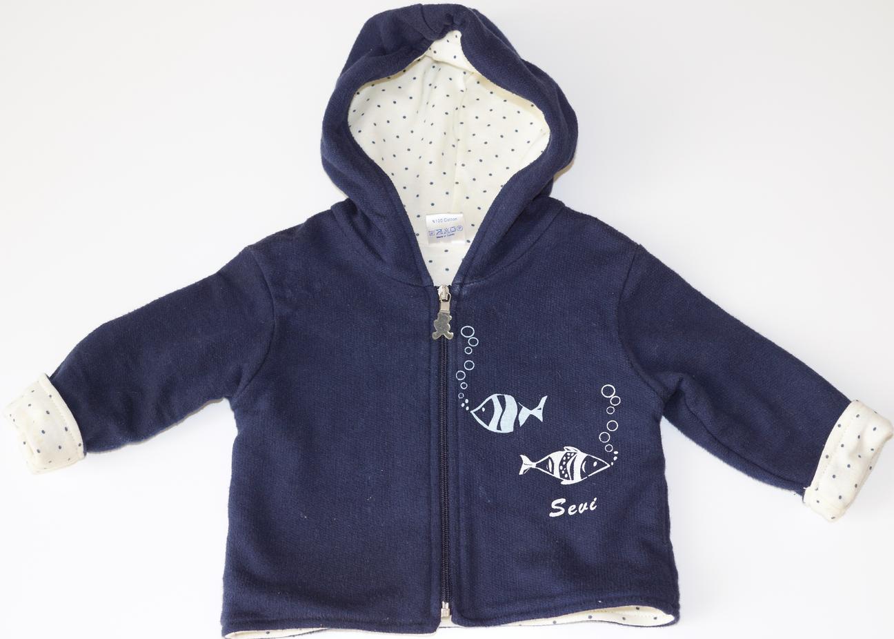 4. Кофточка, унисекс, Севи Беби - на 6 мес. Застежка на молнию, удобный капюшон, одевается и как курточка, и под комбез. 200 руб.