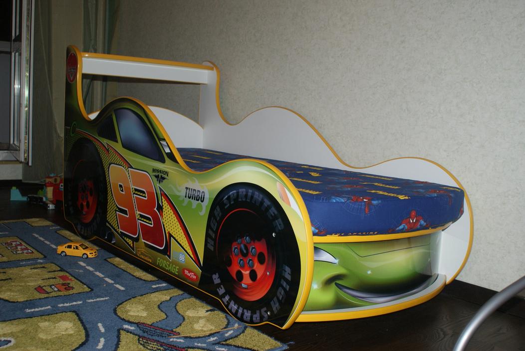 Детская кровать-машинка молния макквин. Желто-зеленая. Габариты длина 155, ширина 71, высота от пола 35. Спальное место 153х66. Фар светящихся нет, колеса не крутятся. Матрас не съемный. Ящик для белья. Очень хорошее состояние. Практически не использовалась по назначению, покупалась в сентябре 2013г. Идеально для мальчика от 2 лет.