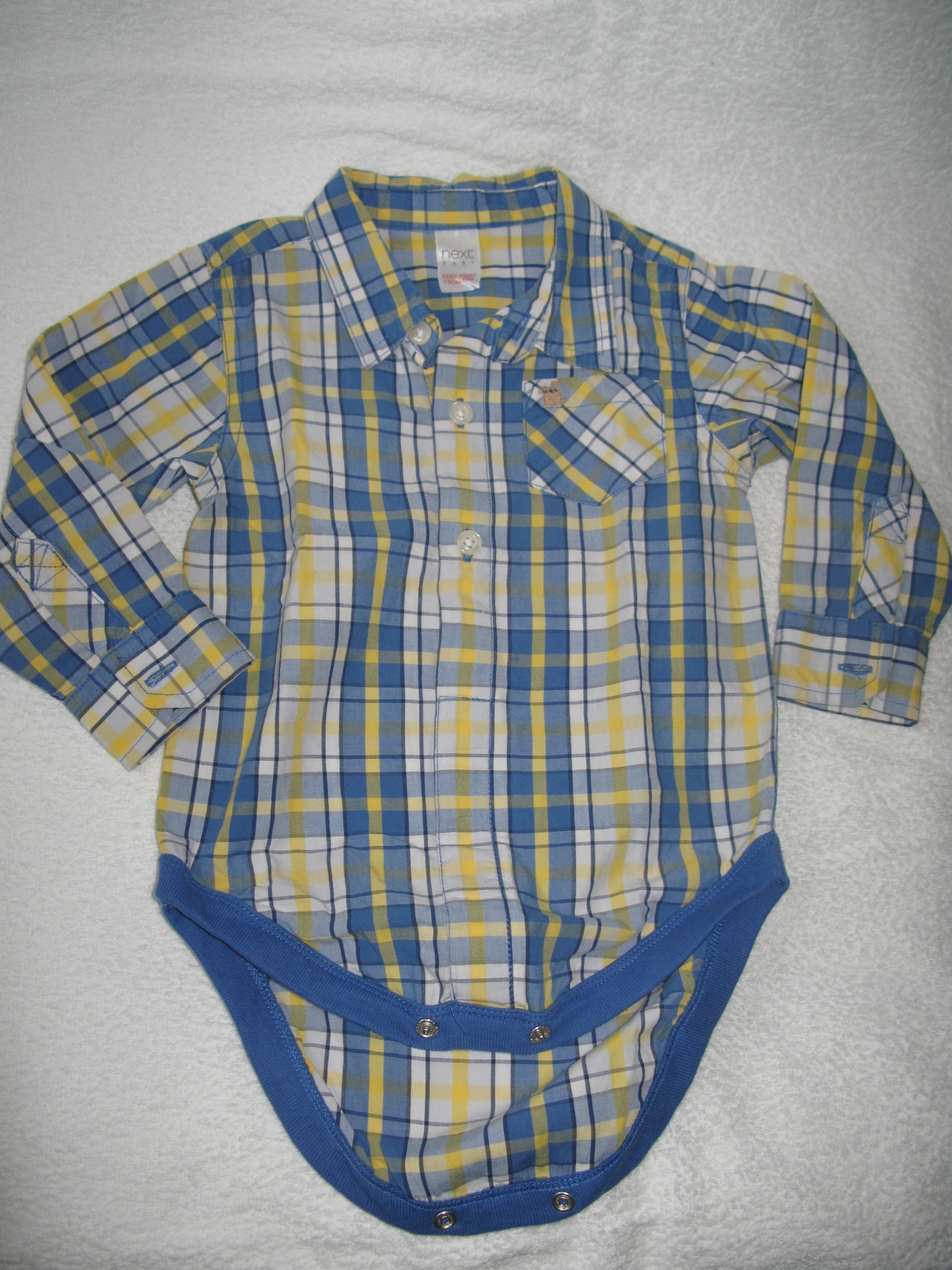 3. Боди-рубашка, клетка желто-синяя, Next, 12-18 мес (86см), точно не помню, но вроде в размер шло, надели 1 раз, состояние отличное.
