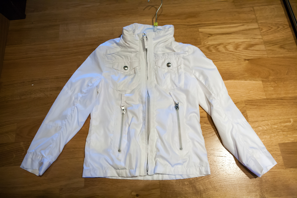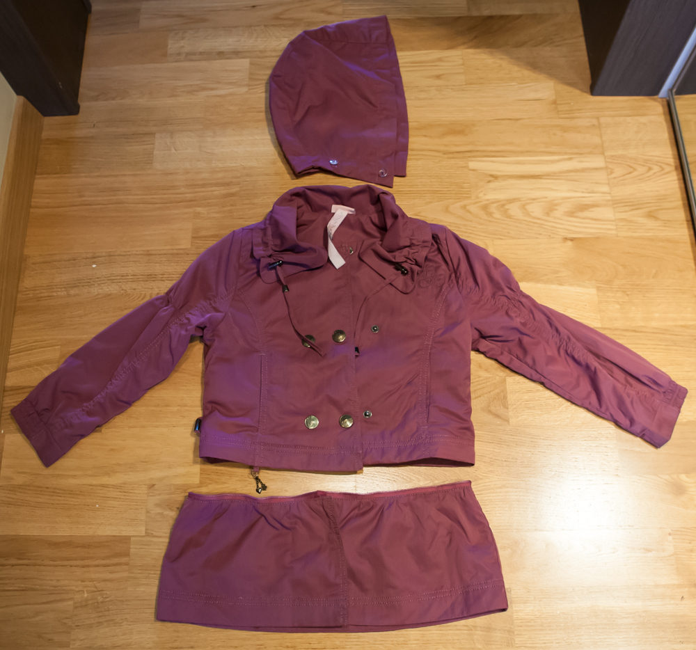 Белая: верх плащовка, подкладка хлопок, в воротнике скрыт капюшон белого цвета. Водоотталкивающая пропитка, но это не куртка для дождя, конечно. Размер 110-116
