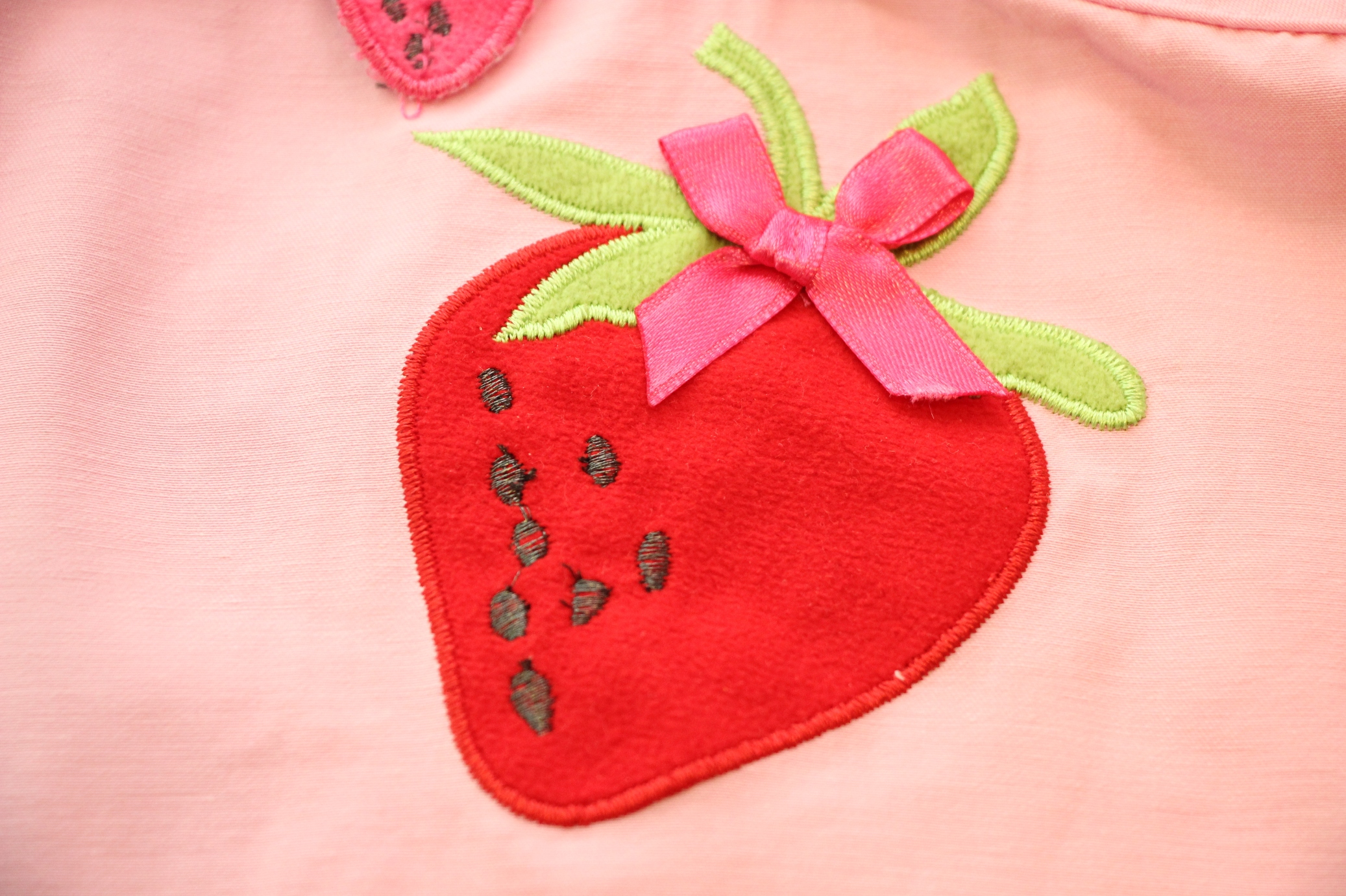 Очень красивое платьице с аппликацией в виде клубничек.